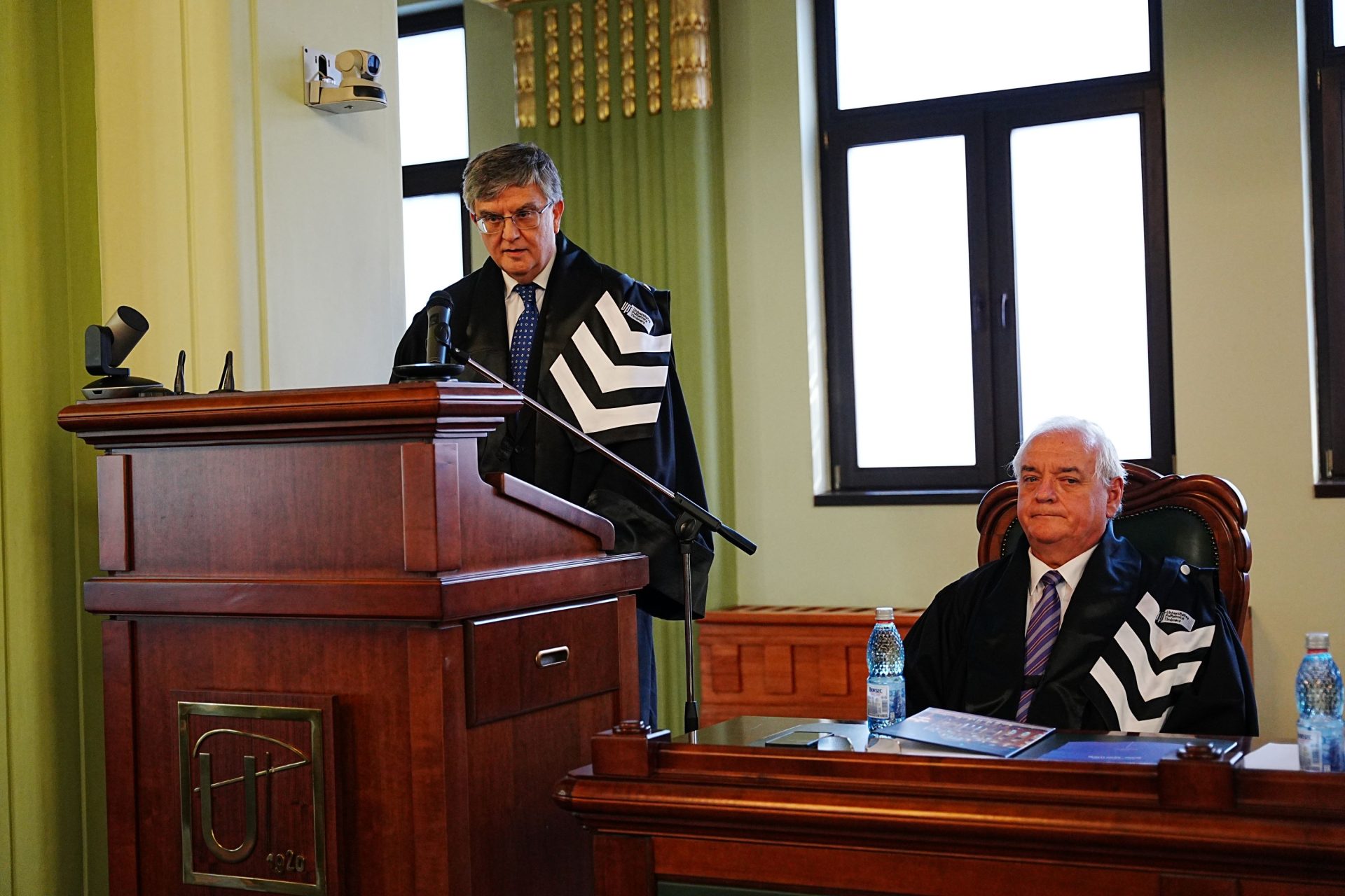 După intonarea imnului Gaudeamus Igitur, de către corul UPT, conf. univ. dr. ing. Florin Drăgan, rectorul Universității Politehnica Timișoara, a adresat mesajul său de salut participanților, menționând că evenimentul se înscrie în seria celor dedicate apropiatei aniversări a 105 ani de la înființarea Politehnicii timișorene. În acest context, rectorul UPT, a prezentat un scurt istoric al înființării Politehnicii timișorene, cu accent pe rolul acesteia, printre altele, de a da o identitate minorității române de la acea dată. De asemenea, conf. univ. dr. ing. Florin Drăgan și-a exprimat bucura de a-l reprimi în comunitatea academică pe unul dintre absolvenții care, prin întreaga sa activitate, a dat consistență idealului universitar al unității dintre adevăr, cunoaștere și slujire.
