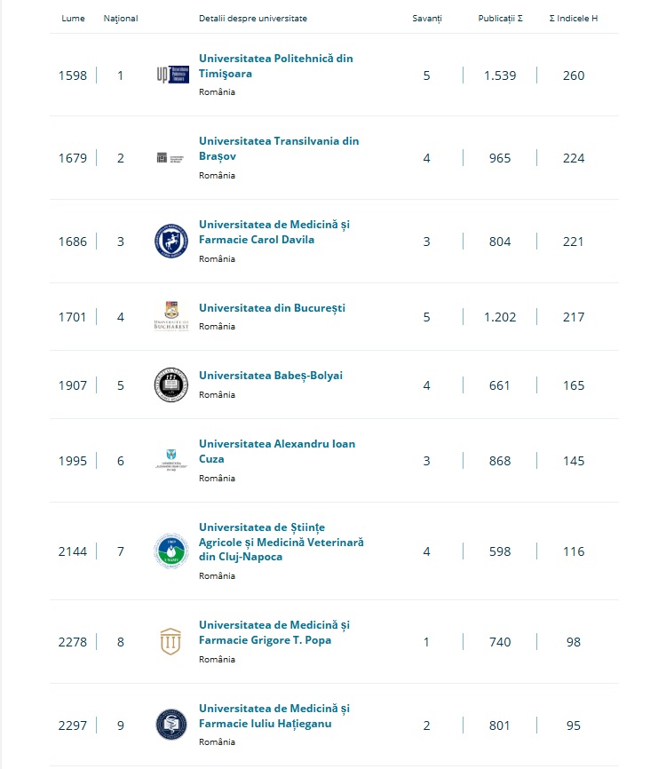 Pe plan național UPT a urcat și a ajuns în poziția de lider în clasament față de precedenta ediție (când ocupa locul 2) și cea din urmă cu doi ani (când ocupa locul 4), iar pe plan internațional, Politehnica timișoreană a urcat de pe locul 1900 (în urmă cu doi ani) pe locul 1600 (anul trecut) și pe locul 1598 în prezent.