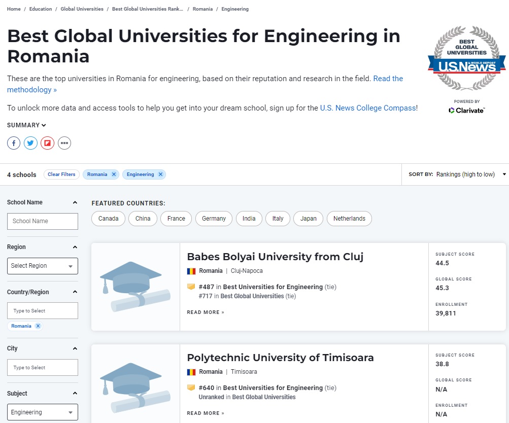 În clasamentul întocmit de US News – Best Global Universities for Engineering in Romania – Universitatea Politehnica Timișoara se situează tot pe primul loc între universitățile tehnice românești, ocupând, de asemenea, locul 640 la nivel mondial pe inginerie. Și în acest caz, criteriile care au propulsat UPT în elita mondială sunt reputația globală și regională, numărul de publicări și conferințe, numărul de citări, numărul de lucrări publicate între primele 10% cele mai citate, colaborările internaționale, numărul de lucrări științifice aflate între primele 1% cele mai citate.