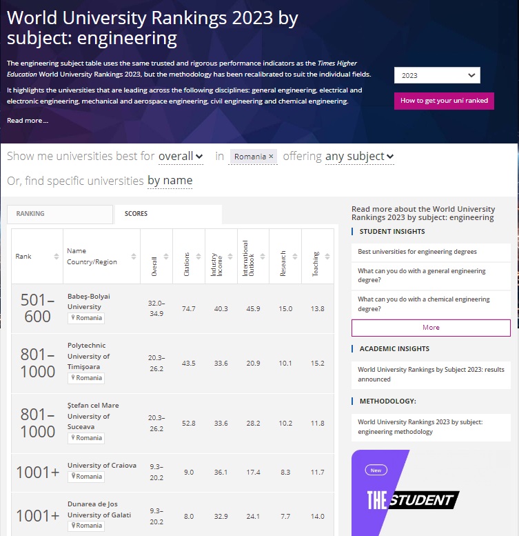 Astfel, conform „Times Higher Education World University Rankings 2023 by subject: engineering”, Universitatea Politehnica Timișoara se poziționează pe locul doi în România și pe primul loc între universitățile tehnice, fiind clasată și între primele 1000 de universități la nivel mondial. În acest clasament, Politehnica timișoreană punctează foarte bine la numărul de citări (în ciuda numărului mic de cadre didactice, comparativ cu alte universități), la venitul din industrie, la reputația internațională, la partea de cercetare și la calitatea educației.