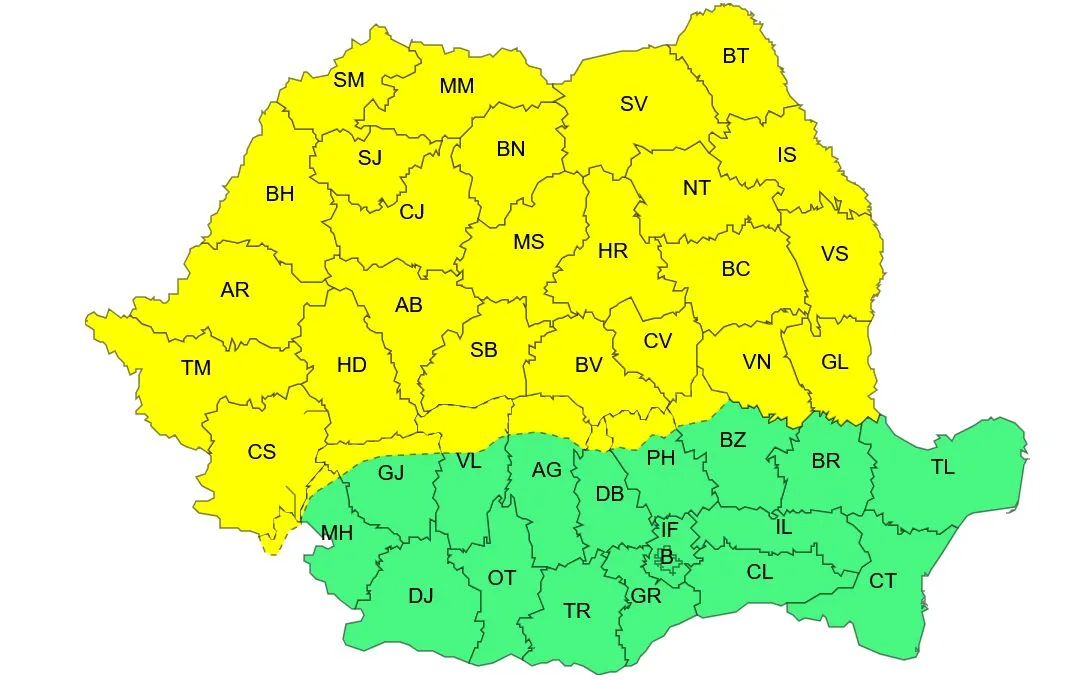 Cod galben de ger în perioada 09 ianuarie, ora 20:00 – 10 ianuarie, ora 20:00 în zonele marcate de ANM pe hartă