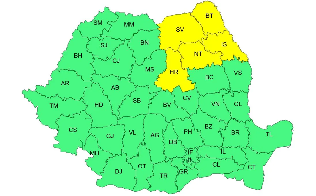Un cod galben de ger va viza cinci județe din nordul Moldovei și estul Transilvaniei, începând de vineri seară, ora 20:00, până sâmbătă, 10 ianuarie, ora 20:00.