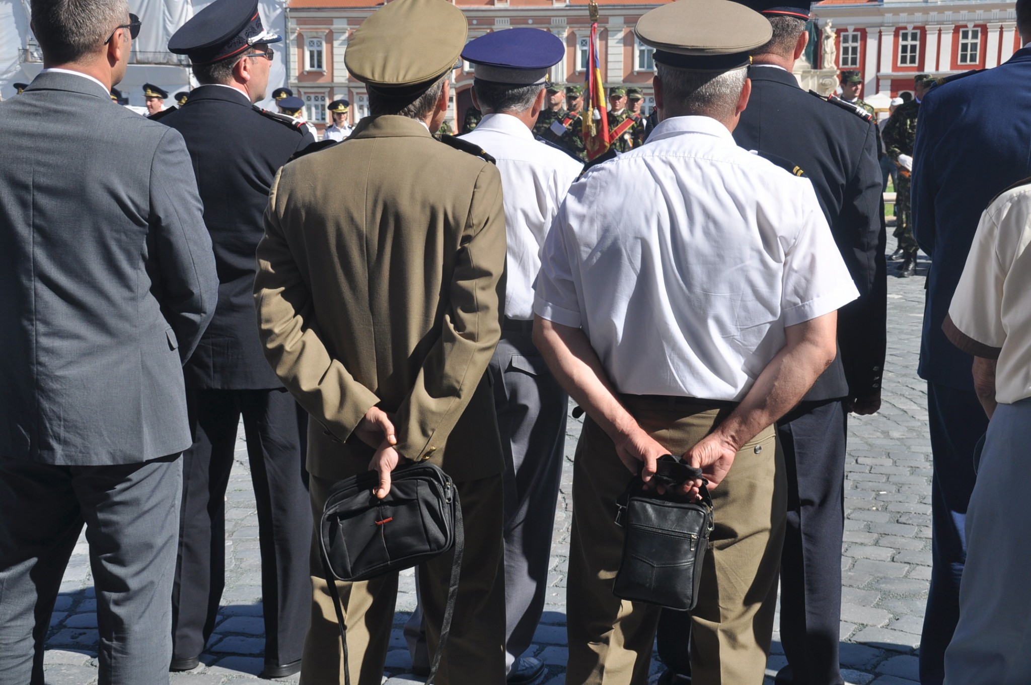 Ofițeri ai armatei române la un moment oficial. Se vede cât respect arată festivității. Așa știu ei să stea în poziție de drepți. Ascund la dos poșetuțele. Ce naiba au nevoie militarii noștrii de poșetă? Cât de bărbați sunt? Soțiile lor știu că le-au dispărut de acasă gentuțele? La caz de nevoie, ce vor face, dau în capul inamicului cu poșeta? Ori îl amenință cu pila de unghii? Oare tot acolo își țin rujul și fardurile? Se poate înțelege că nu se pot despărți de borsetele lor dragi în care țin acte, bani sau cine știe ce alte năzbâtii de valoare, dar în acest caz puteau veni în civil. Sau măcar câteva minute să se debaraseze de prețioasele trăistuțe. Așa aduc mai degrabă cu acei nefericiți patrupezi de tracțiune ce sunt obligați de legi caraghioase să aibe sub coada un sac de colectare a emisiilor ecvestre. Adică mai pe șleu spus de adunat bălegarul.