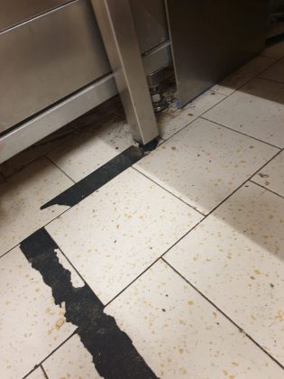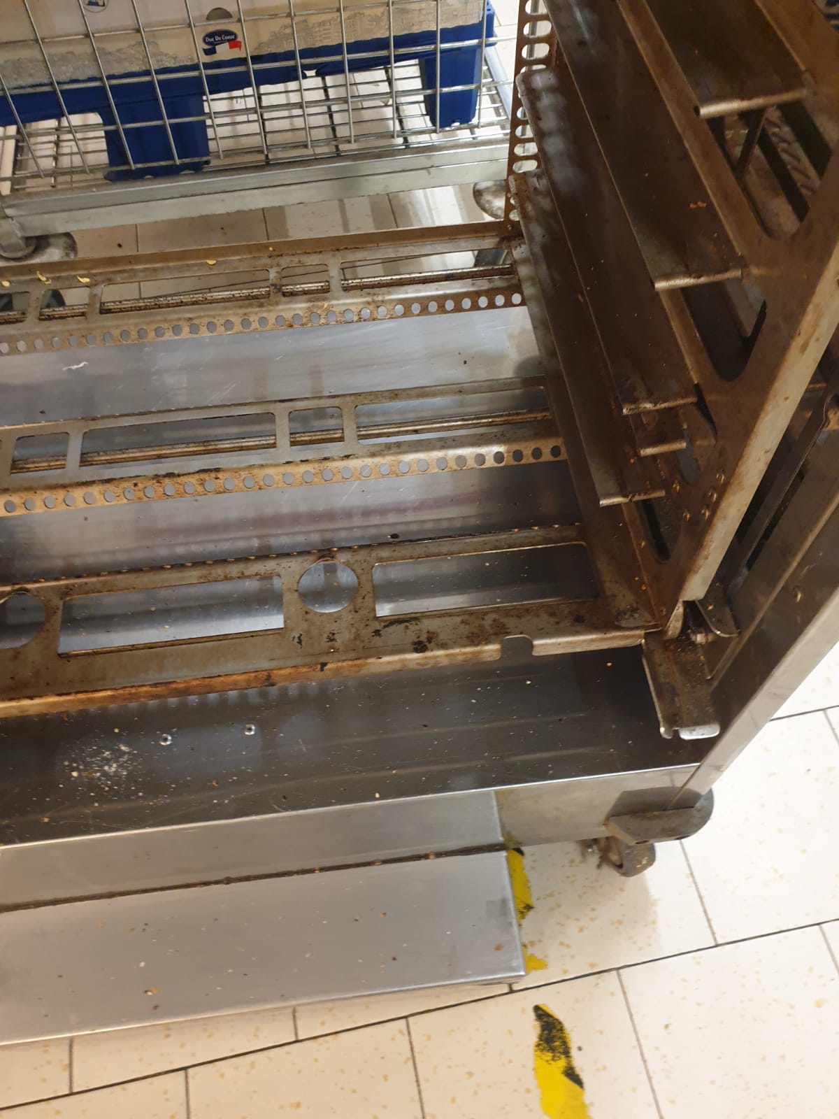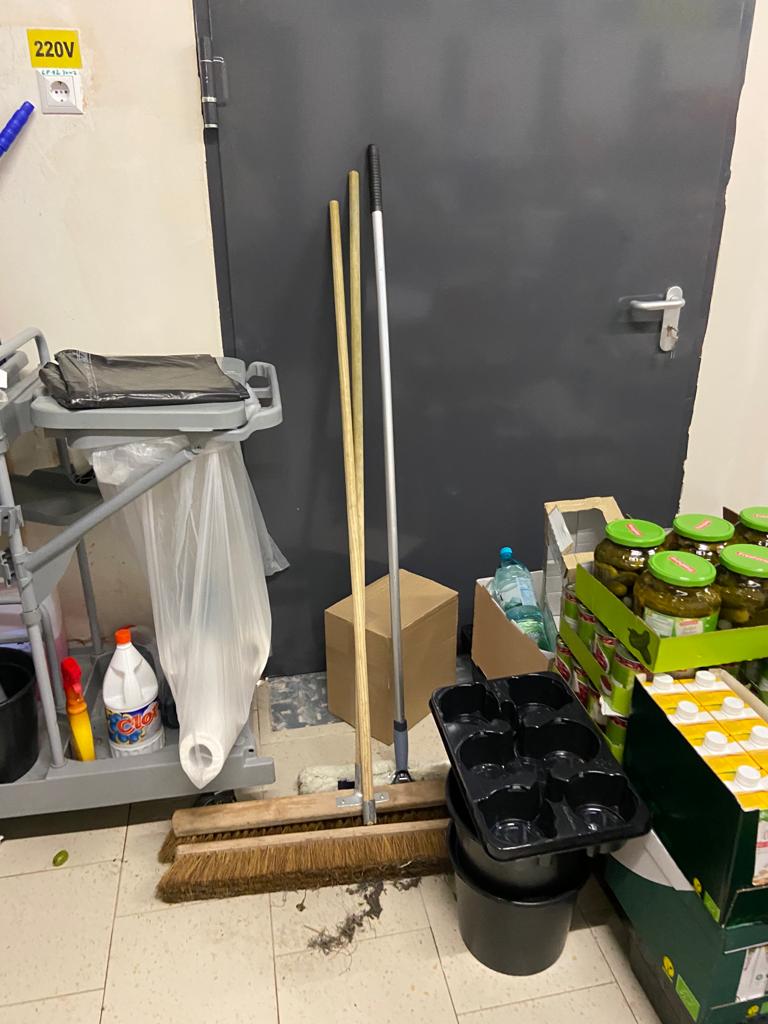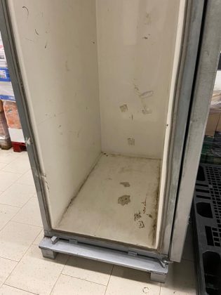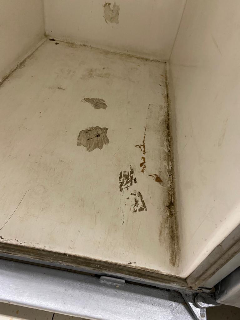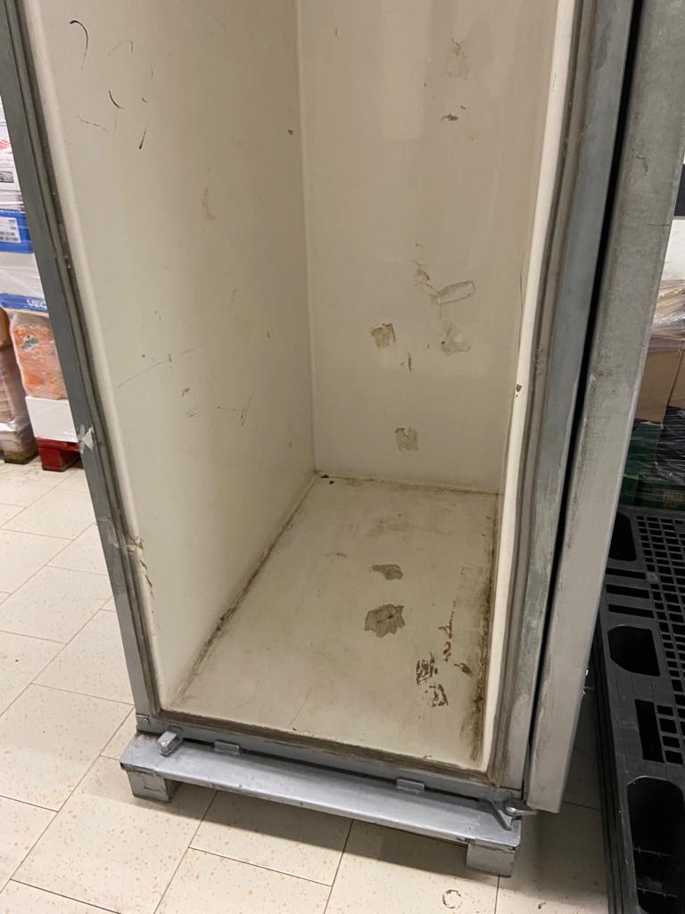 • utilizarea unor vitrine frigorifice neigienizate corespunzător, cu chedere murdare, strat de praf, mâzgă, cu scurgeri de lichide și rugină și a unor lăzi frigorifice cu acumulări masive, excesive de gheață, praf, impurități, resturi alimentare și păr