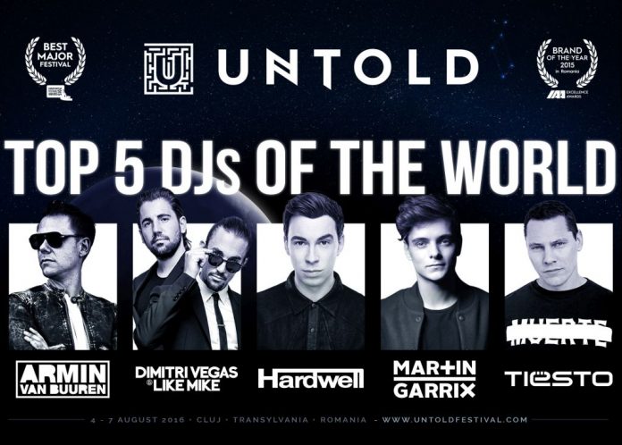 UNTOLD 2016 va avea loc în perioada 4-7 august, iar pe scenă vor urca TOP 5 DJ ai lumii, DIMITRI VEGAS&LIKE MIKE, ARMIN VAN BUUREN, HARDWELL, MARTIN GARRIX, TIESTO alături de alți peste 150 de artiști internaționali de renume, dintre care: AFROJACK, FAITHLESS, PAROV STELAR, Ummet Ozcan, Chase and Status DJ Set, Dannic, Dubfire Live: Hybrid, Dub Fx, Ella Eyre, James Arthur, Jamie Jones, Jeru the Damaja, Kwabs, Lost Frequencies, Mazde, Nahko and Medicine for the People, Netsky DJ Set, Pendulum & Verse DJ Set, Route 94, Rudimental DJ, Sasha, Scooter, Sharam, The Asteroids Galaxy Tour, Y’akoto.