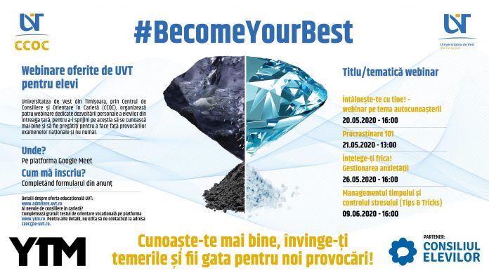 De aceea, Universitatea de Vest din Timișoara, prin Centrul de Consiliere și Orientare în Carieră, îi invită pe elevi să participe la webinarele organizate în vederea facilitării demersului lor educațional și profesional viitor. Vor fi abordate teme despre cunoașterea de sine, managementul timpului, sau managementul stresului ori despre cum anume să fim productivi, învingându-ne acea voce care ne șoptește „încă un episod și apoi te-apuci de treabă”. Toate webinariile se vor organiza pe platforma Google Meet, vor dura aproximativ 90 de minute fiecare, iar participarea este gratuită.