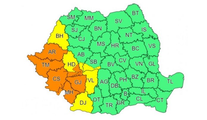 Zona de vest a țării se va afla, de vineri seara, sub incidența a două coduri portocalii de vreme instabilă și de ploi. Prima avertizare este valabilă pentru intervalul 17 iulie, ora 23:00, – 18 iulie, ora 09:00, iar cel de-al doilea pentru 18 iulie, ora 09:00, – 19 iulie, ora 22:00.