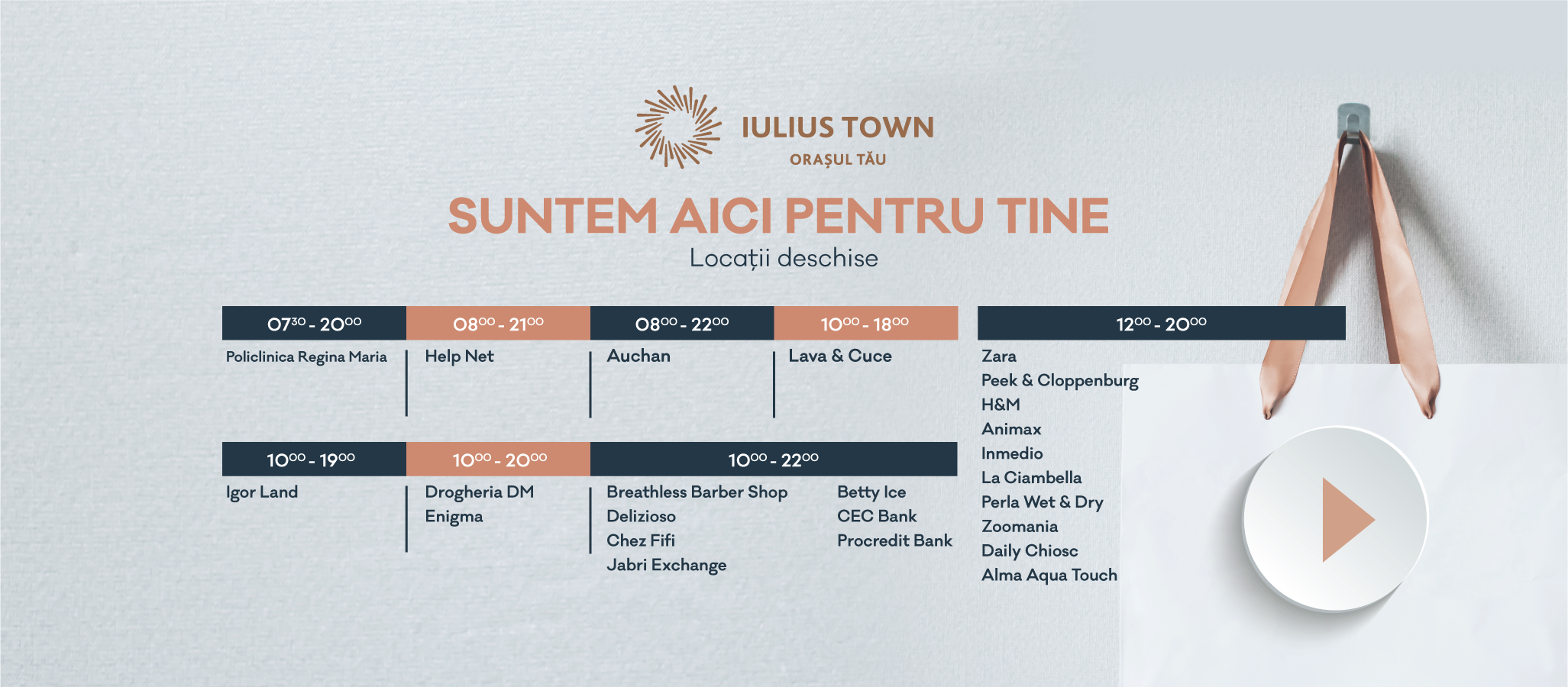 Serviciile medicale oferite de Policlinica Regina Maria sunt accesibile în intervalul orar 7.30 – 20.00. Preparatele preferate pot fi comandate prin platforme delivery sau în regim to go, de la Taco Bell, Noodle Pack, Pizza Hut și Daily. Programul locațiilor deschise este disponibil pe www.iuliustown.ro.