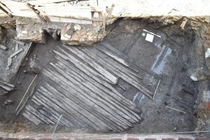 Primele structuri arheologice din lemn apar încă din primul plan de cercetare arheologică, iar deja în planul 2 și 3 se observă întreaga structură de lemn a unei locuințe de dimensiuni mari. În secțiunea arheologică locuința este surprinsă cu o dimensiune de 9 metri lungime și lățime de aproximativ 5 metri, suprinsă în latura sudică a acesteia. În latura nordică a secțiunii au fost observate rămășițe ale unei alte locuințe, însă secțiunea arheologică surprinde o porțiune mică din aceasta (aprox. 2×1 metri). În analiza preliminară a acestei locuințe s-au identificat cel puțin trei încăperi, două dintre acestea fiind spre nord (spre stradelă) și o încăpere mai mare în partea sudică. Cele două încăperi dinspre stradelă erau posibile spații de locuire, fapt ce reiese din cantitate semnificativă de material arheologic specific activităților casnice (ulcioare, castroane, cuțite, pipe, încălțăminte din piele etc.).