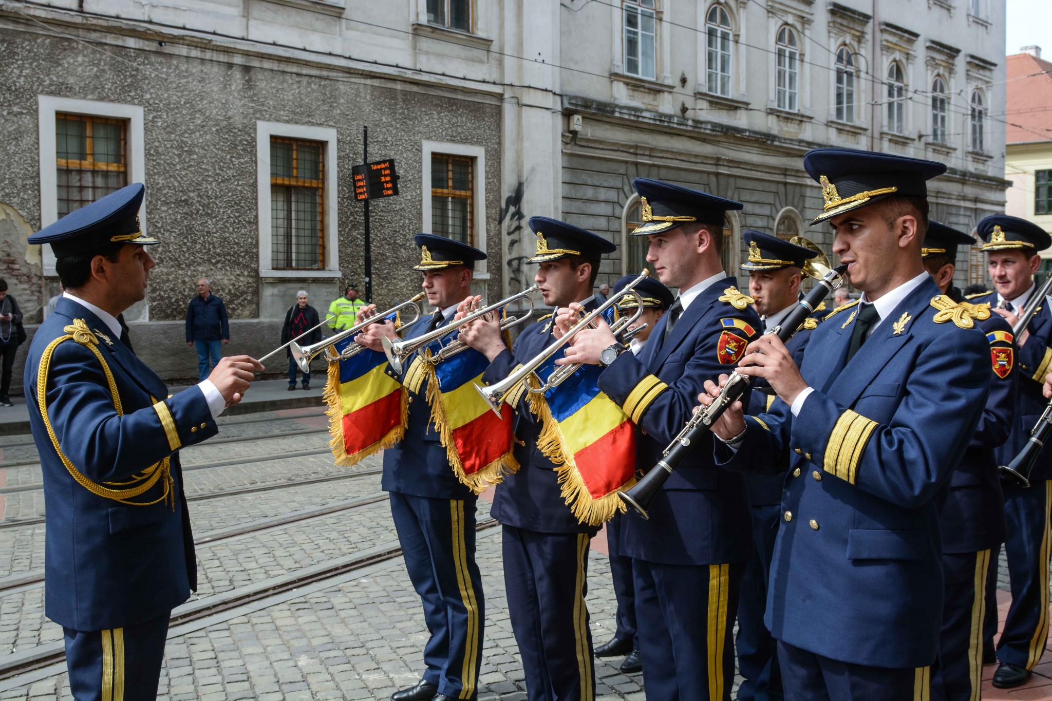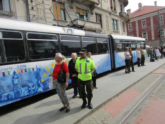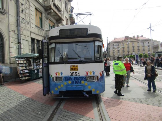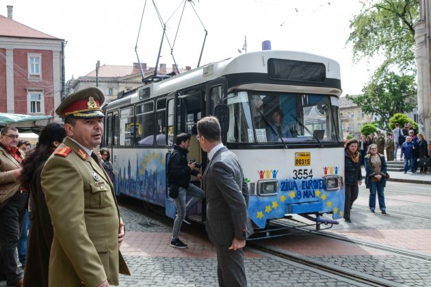 La ora 11,00 din Piaţa Libertăţii, pe ritmurile Muzicii Militare a Brigăzii 18 Cercetare Supraveghere Banat, a avut loc momentul festiv de plecare a tramvaiului aniversar dedicat sărbătoririi a 10 ani de la integrarea României în Uniunea Europeană.